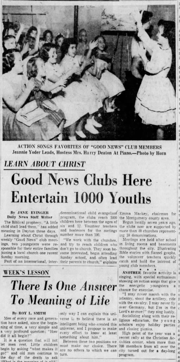 Part of an international, interdenominational child evangelism program, the clubs reach 1000 children here between ages six and 12. Volunteer teachers and hostesses for the meetings number more than 100.