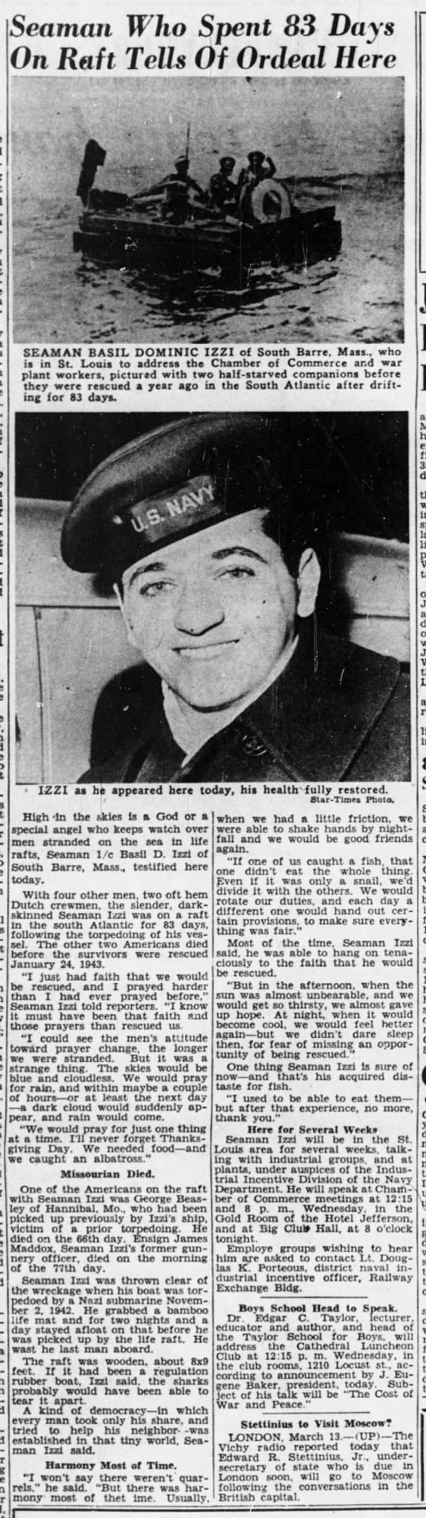 With four other men, two of them Dutch crewmen, the slender, dark-skinned Seaman Izzi was on a raft in the south Atlantic for 83 days, following the torpedoing of his vessel. The other two Americans died before the survivors were rescued January 24, 1943.